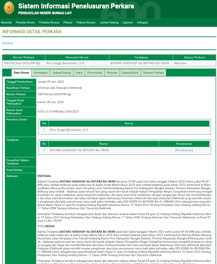 Foto. Riwayat Informasi (SIPP) Batara Pernah di Penjarakan dalam kasus Penghinaan dan Pencemaran Nama Baik.