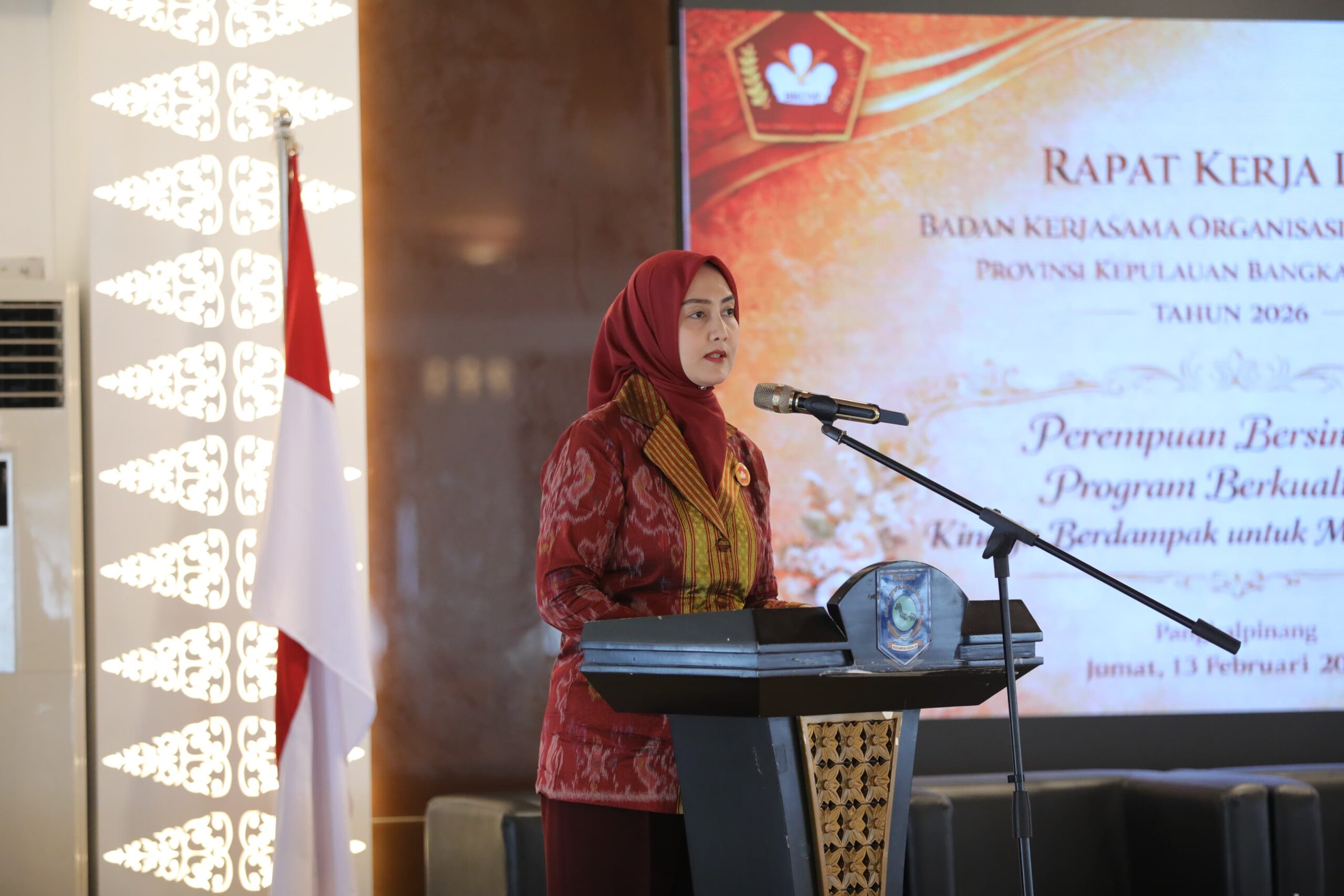 JENDELABABEL.COM, PANGKALPINANG — Ketua Badan Kerja Sama Organisasi Wanita (BKOW) Noni Hidayat Arsani, membuka Rapat Kerja Daerah (Rakerda) BKOW Babel, di Gedung Mahligai, Rumah Dinas Gubernur Babel, Jumat (13/2/2026).