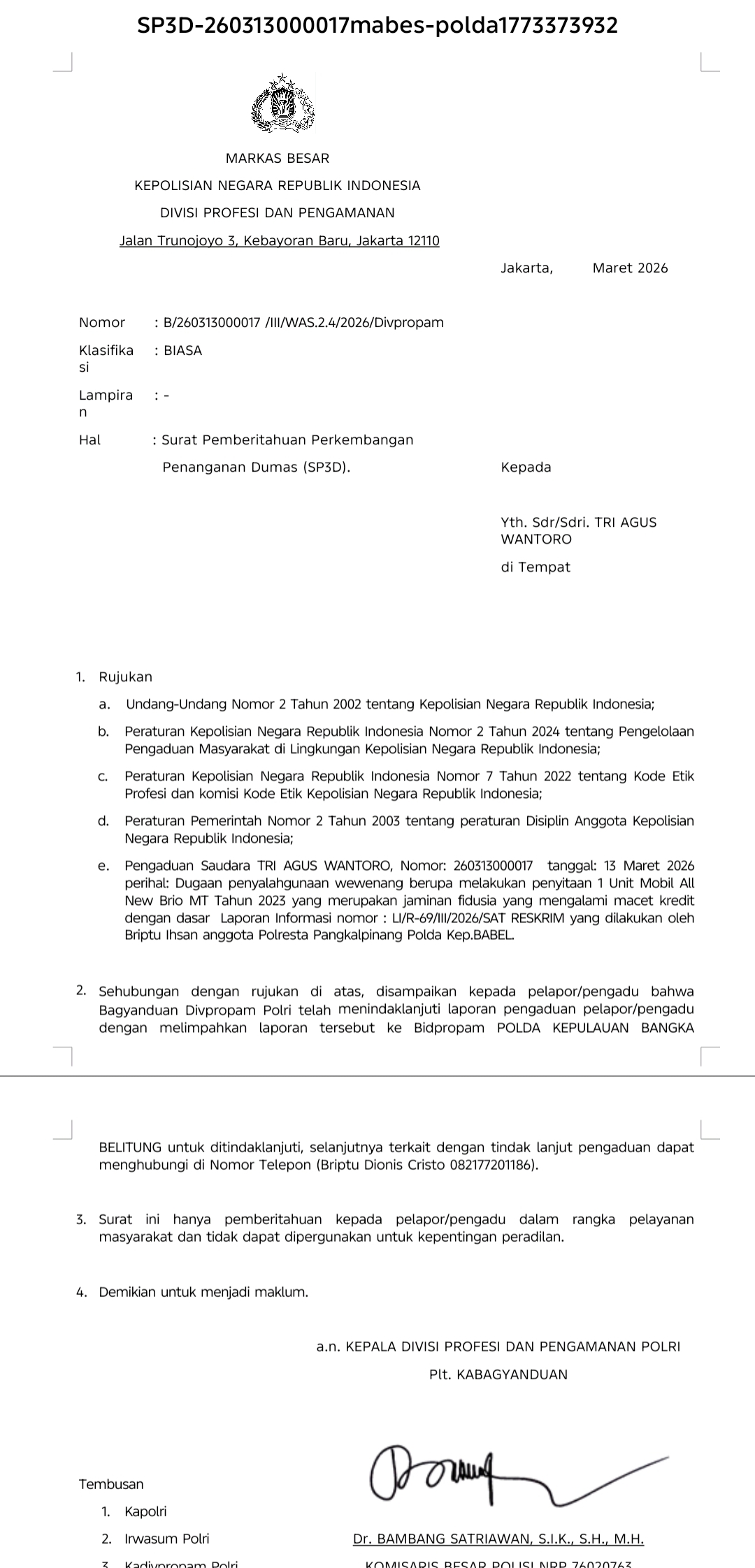 Terima kasih… Proses masih berjalan. Ujarnya singkat kepada jejaring media ini.