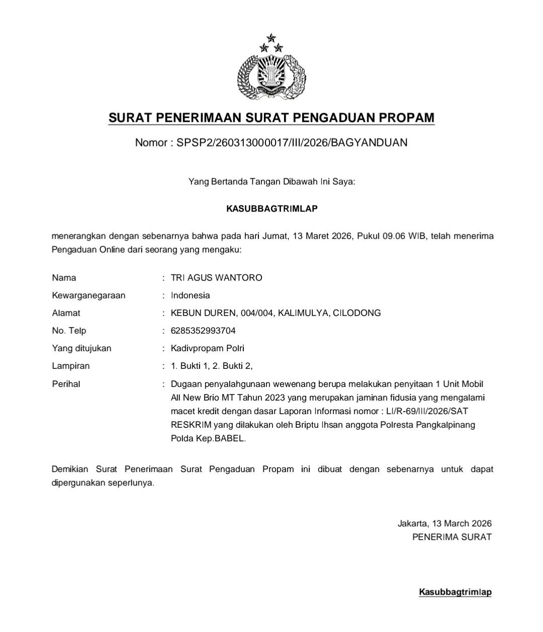 Di penghujung penyampaiannya, Kuasa Hukum FR ini pun meminta agar Kepolisian, khususunya Polresta Pangkalpinang bisa lebih profesional dan presisi dalam mengayomi masyarakat bukannya malah melindungi dan menjadi benteng para Debt Kolektor.