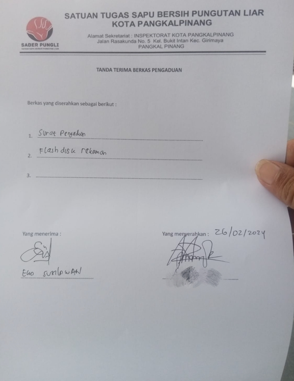 Dalam surat laporan yang dikeluarkan oleh Satuan Tugas Sapu Bersih Pungutan Liar Kota Pangkalpinang (Saber Pungli) yang diterima oleh Eka Susilawan selaku penerima pengaduan.