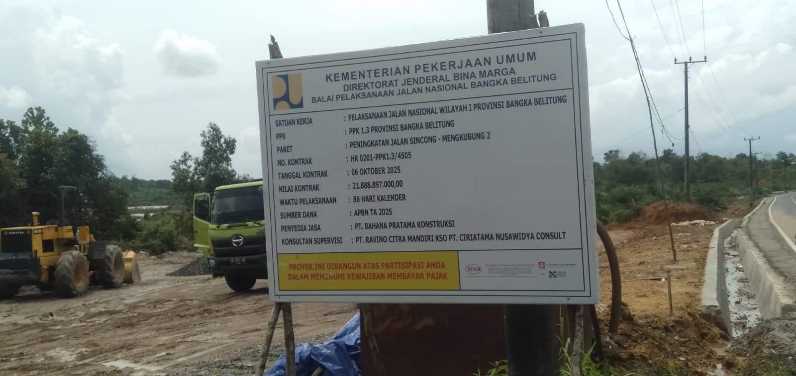 Proyek ini berada di bawah Balai Pelaksanaan Jalan Nasional Bangka Belitung, Direktorat Jenderal Bina Marga, Kementerian Pekerjaan Umum, dengan nilai kontrak Rp21.888.897.000, bersumber dari APBN Tahun Anggaran 2025. Pelaksana proyek tercatat PT Bahana Pratama Konstruksi, dengan konsultan supervisi PT Ravino Citra Mandiri KSO PT Ciriatama Nusawidya Consult.