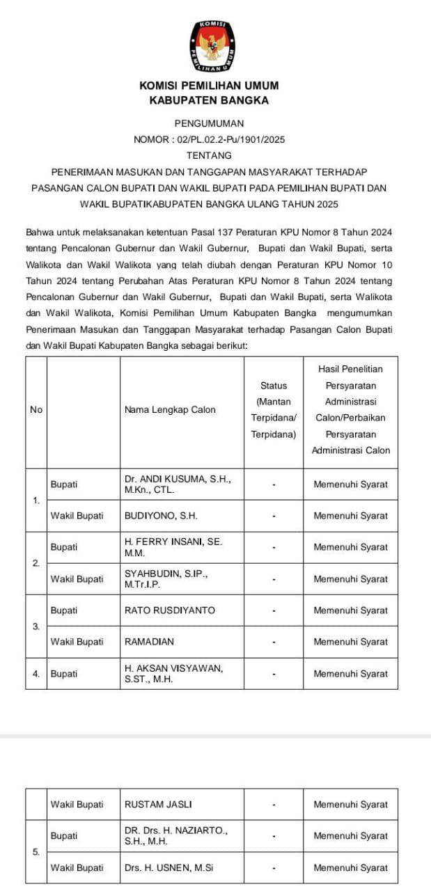 Kepastian itu tertuang dalam Berita Acara KPU Bangka Nomor 02/PL.02.2-Pu/1901/2025, setelah proses penelitian dokumen perbaikan syarat calon rampung dilakukan.