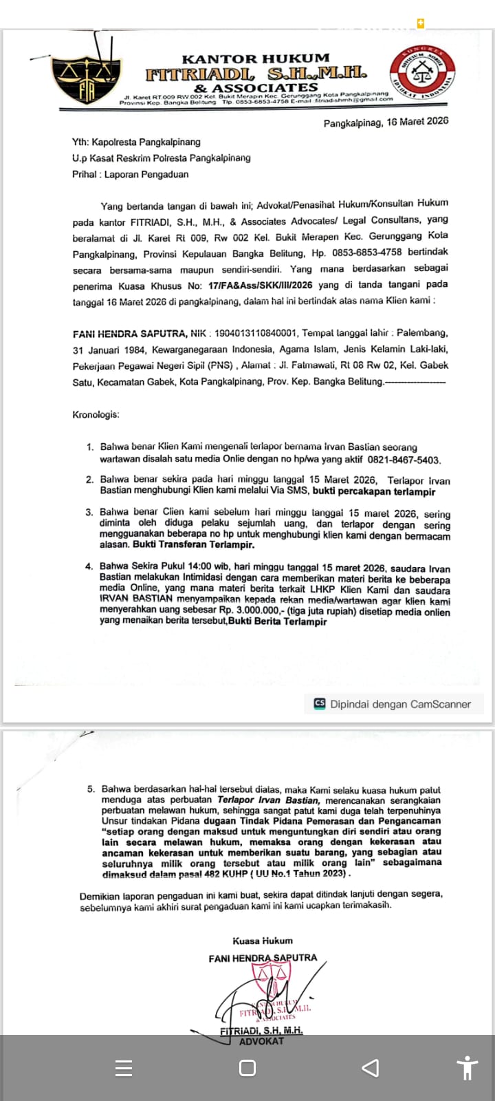 JENDELABABEL.COM, PANGKALPINANG  — Nasib naas yang di alami  oknum wartawan sala-satu media online lokal berinisial IB resmi  di laporkan ke Aparat Penegak Hukum (APH) Kota Pangkalpinang yang diajukan oleh Fitriadi, S.H., M.H., selaku kuasa hukum dari Fani Hendra Saputra, melalui mekanisme Laporan Pengaduan (Lapdu) ke Satreskrim Polresta Pangkalpinang. Senin (16/3/2026).